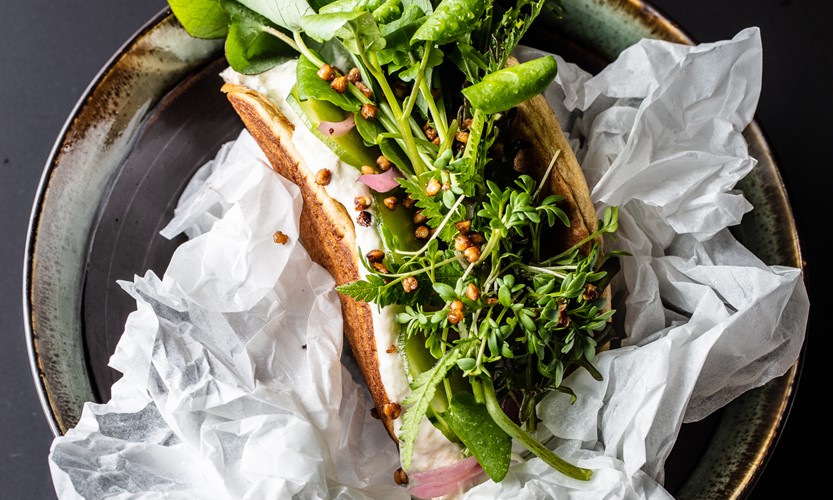 med ertestuing, agurkmix og remulade...